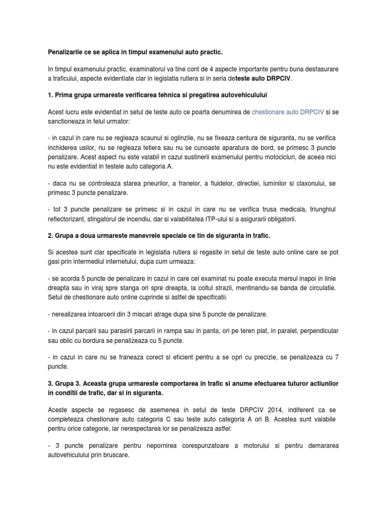 Punctele de penalizare la proba practică fiecare greșeală făcută este notată cu un anumit număr de puncte. Punctul de pemalizare si punctul amenda sunt notiuni total diferite. Nerespectarea semnificaţiei indicatorului „oprire, instalat la trecerea la nivel cu o cale ferată;